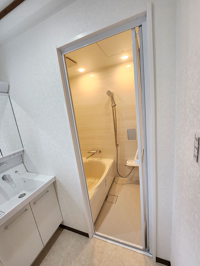 下見の段階からご要望に合わせてご提案をさせていただきました。洗面所までの廊下や入口のドアの取り替え等で浴室に入るまでスムーズに使えることを意識してリフォームでき、私としても良い工事ができたと思っております。