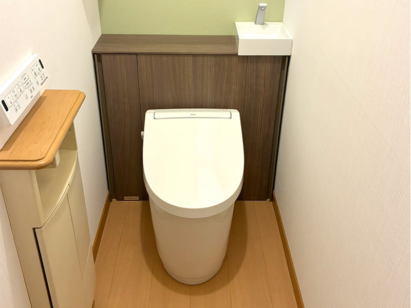 トイレ:LIXIL Jフィット アクセントクロス:リリカラ BASE(品番:LB-9573) ベースクロス:リリカラ BASE(品番:LB-9582) 床材(クッションフロア):リリカラ クッションフロア(品番:LH81605) |