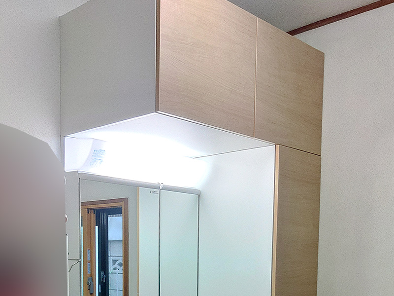 しかし、それだけではタオルやバケツ、息子さんの化粧水などが収納できないため、トールキャビネットをご提案したところ、ご要望にぴったりで工事後もご満足いただけました。